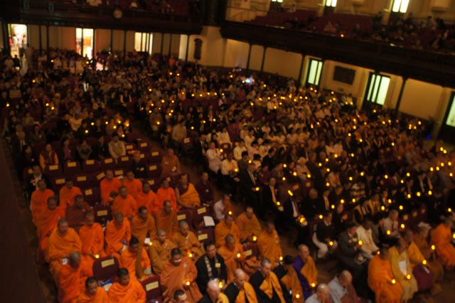 More than 1700 devotees of Buddhism at the Sydney Townhall to mark the 2600th anniversary of the Buddha’s enlightenment, referred to as Vesak Day, on Sunday, May 29. Holding a candlelight, each participant reached out to the victims of the world’s natural disasters by dedicating the event to them.