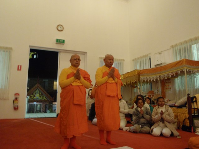 Vanchai (68), who had since been in Auckland, New Zealand less than a month after returning to a non-monastic life, from his three months ordination in Thailand, had readily decided to fulfil the wishes of the community in Auckland without hesitation and a positive assurance. The community wished to have five monks to stay over the period of Buddhist Lent in order to hold the Katina ceremony, which comes at the end of Vassa, the three month rains retreat. He joined the ordination in Sydney and flew back to accompany the other four monks in the Auckland centre.