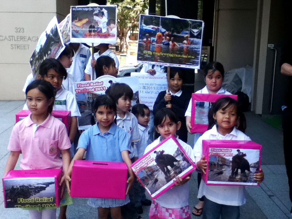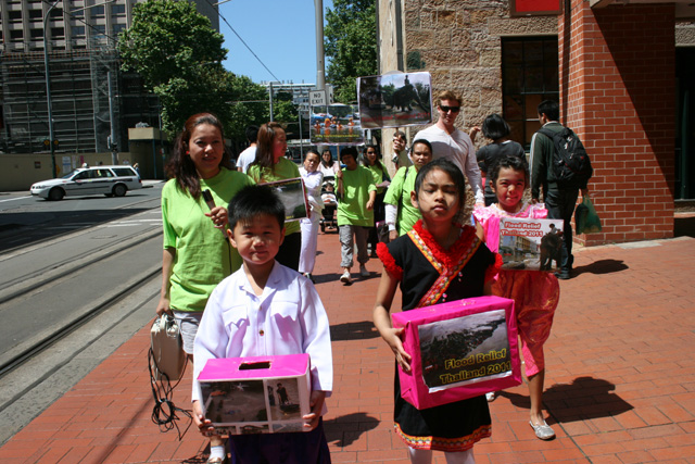 Thai youth from 60TH Dhammachai Education School has raised awareness of many Thais and shoppers in Thai town at the heart of Sydney CBD about the Thailand worst flood in half of the century.