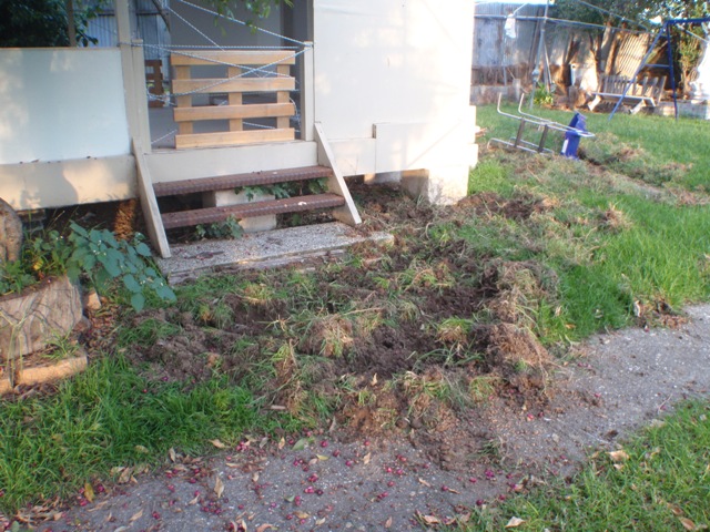Six pigs from the next property came in to attack the lawn around the small Vihara at the temple. Usually at Sunday service we could hear loud music from our next door neighbour but there was no music on this Sunday. We had the pigs instead. They have made a terrible damage to the lawn around the Vihara.