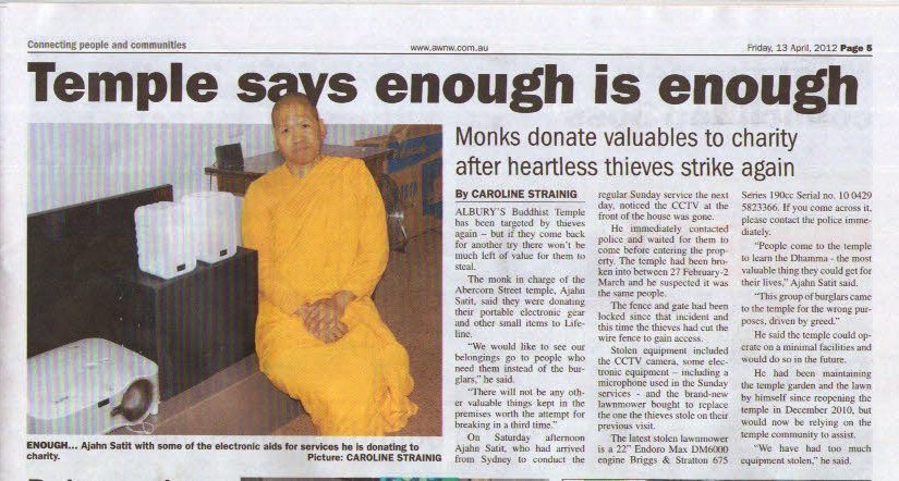 After a few unfortunate incidents – the burglary – twice in 6-7 weeks, garden equipments and machineries, old and newly replaced ones, were part of the items taken. Ajahn Satit took an ironic step to fix the problem by donating any items of some value kept at the temple, to other charities. The idea is to deter the burglar from the temple as there is nothing valuable enough for them to come back and repeat the offence. The strategy seems to work so far.