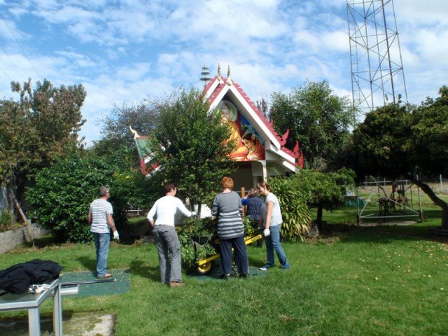 This Sunday also marked another page of Wat Albury. Now that the temple owns no garden tools and equipments, the maintenance of the ground became the group activity for the members. It was the first meeting for the task on Sunday. Everyone brought their own tools to help, two lawnmowers, two bush cutters and many other hand tools. After the service, everyone got out in the garden and started to work. It was a nice day, clear blue sky and everyone seemed happy to lend a hand to keep the temple ground in good order. It was good to see the smile on everyone’s face as evidence in the photos.
