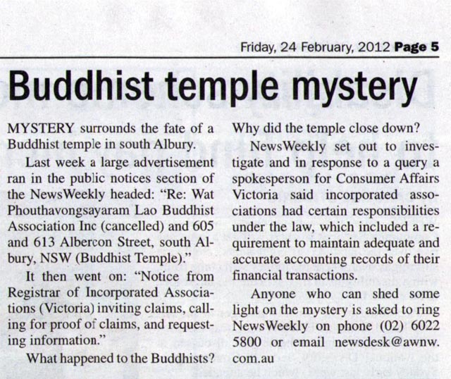 It has been more than a year since the Consumer Affair of Victoria (CAV) made public announcement in Albury-Wodonga Newsweekly about the winding up and distributing of the properties of the deregistered association, Wat Phouthavongsayaram Lao Buddhist Association Inc. Apparently, the issue has not yet been finalised which makes the ownership of the temple at Abercorn Street still uncertain.