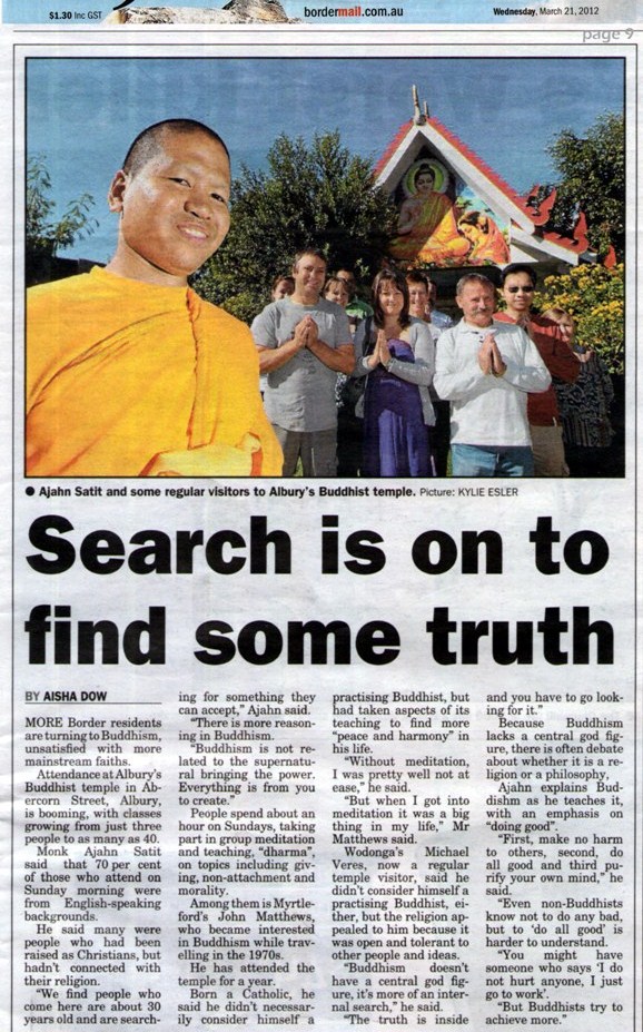 Three years ago Ajahn Satit came to Albury to re open Wat Buddhawongsayaram, a Buddhist temple at Abercon Street. He has since been holding a Sunday service and re-established the Buddhist community here in Albury. Some may not know that this is only one part of his work. His residence is at a temple in Sydney where he works for a Buddhist community there during the weekday. He is also one of the committee members of the Buddhist Federation of Australia Inc. based in Sydney. He travels to Albury on the weekend to hold the Sunday service for the Buddhist community on the border every week.