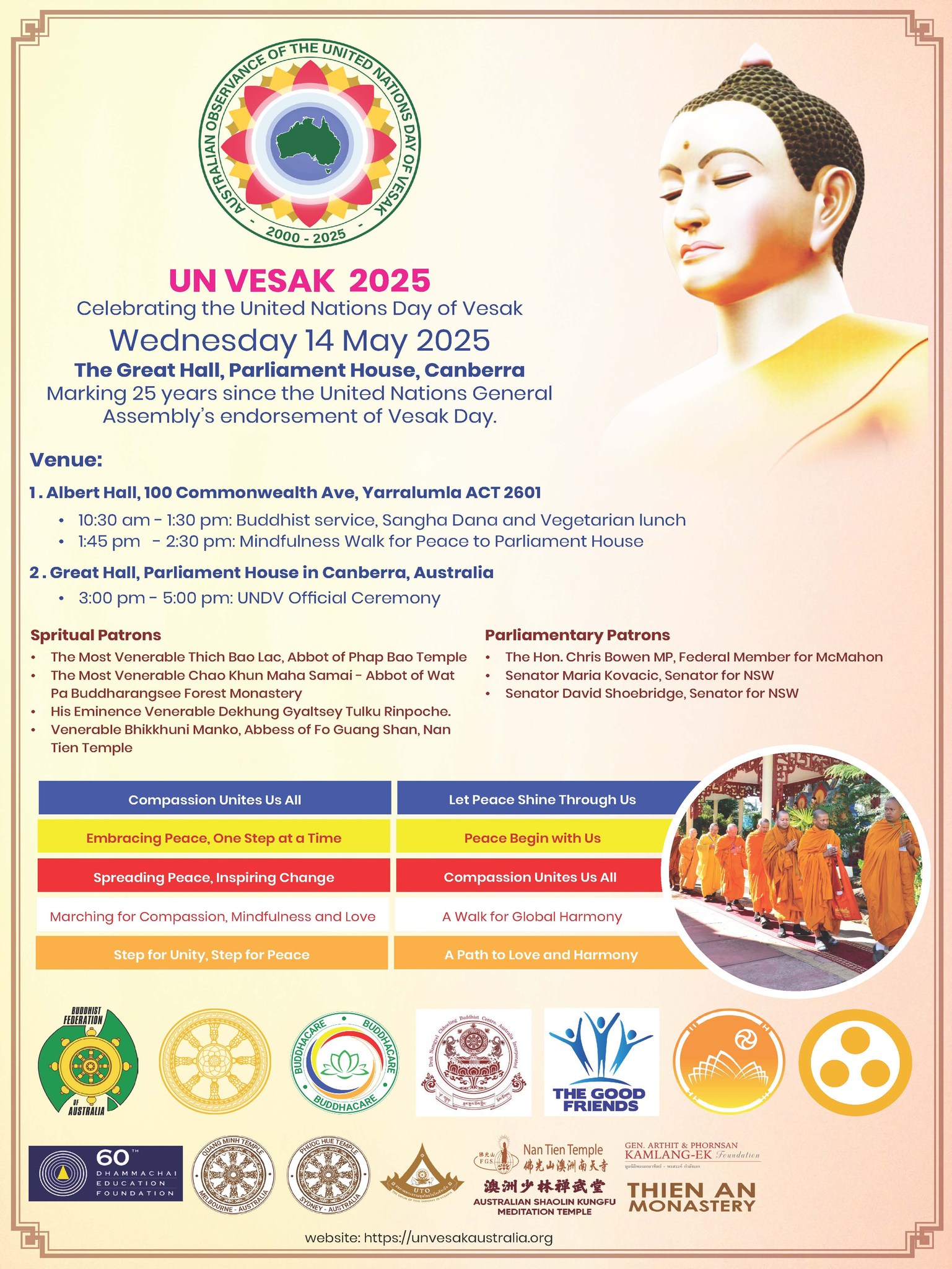 Join us in commemorating a momentous milestone—the 25th anniversary of the United Nations Day of Vesak—on Wednesday, 14 May 2025. Hosted at the iconic Albert Hall in Canberra, this year’s celebration offers a profound and uplifting experience for all.